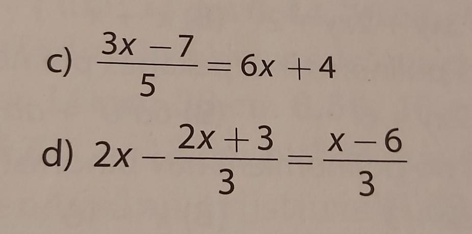 c)\\\frac{3x-7}{5}=6x+4\\3x-7=(6x+4)*5\\3x-7=30x+20\\-27=27x\\x=-1