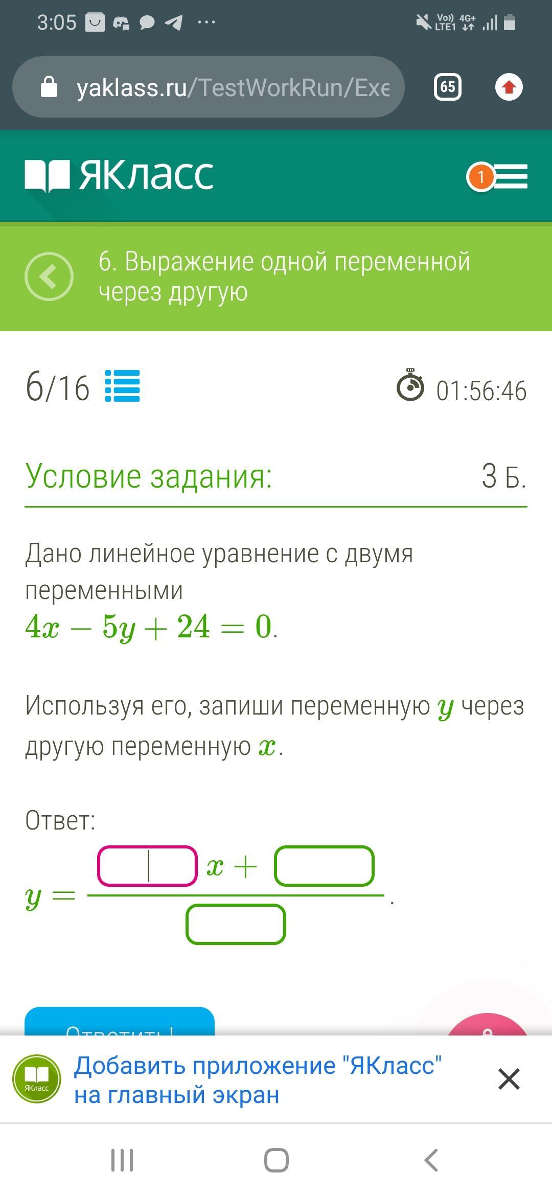 Дано линейное уравнение с двумя переменными 4x-5y+24=0 используя его, вырази переменную y через другую переменную х