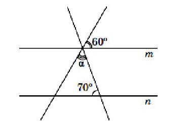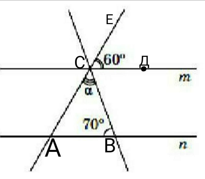 ∠АСЕ – розгорнутий=180°, тоді ∠α=180–70–60=180–130=50°
