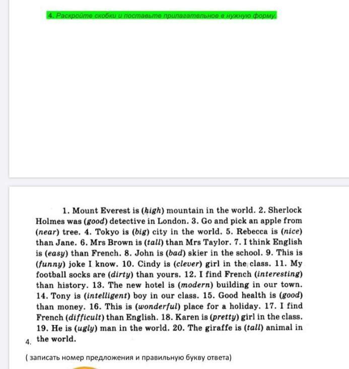 the highest, the best, the nearest, the biggest, nicer, taller, easier, the worst, the funniest, the cleverest, dirtier, more interesting, the most modern, the most intelligent, better, the most wonderful, more difficult, the prettiest, the ugliest, the tallest