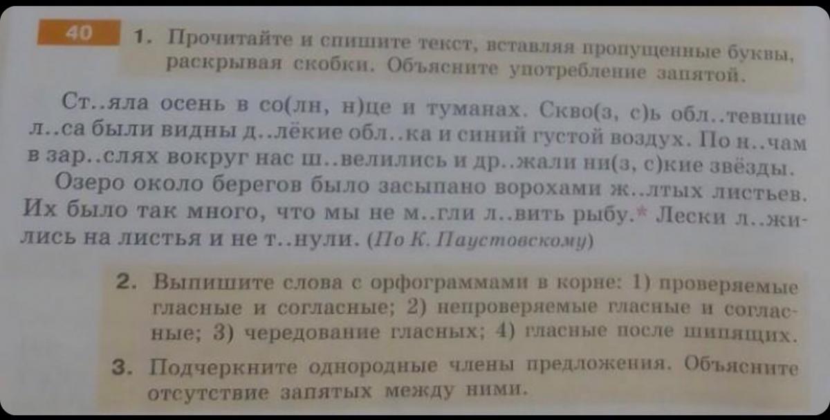 Озеро около берегов было засыпано ворохами жёлтых листьев. Их было так много, что мы не могли ловить рыбу. Лески лежали на листьях и не тонули (однородные сказуемые).
