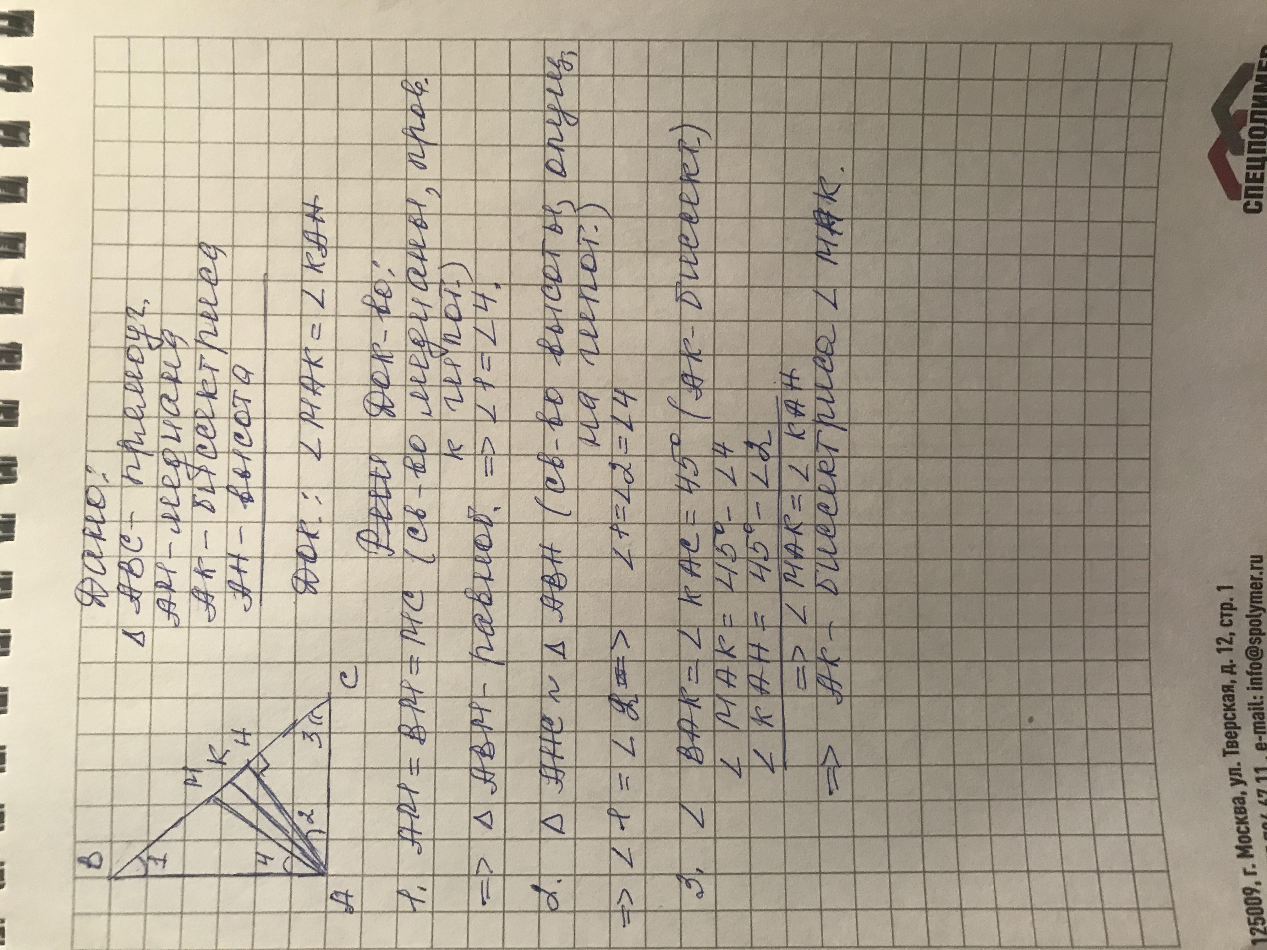 Докажите, что в прямоугольном треугольнике биссектриса прямого угла делит пополам угол между медианой и высотой, проведёнными из этой же вершины.