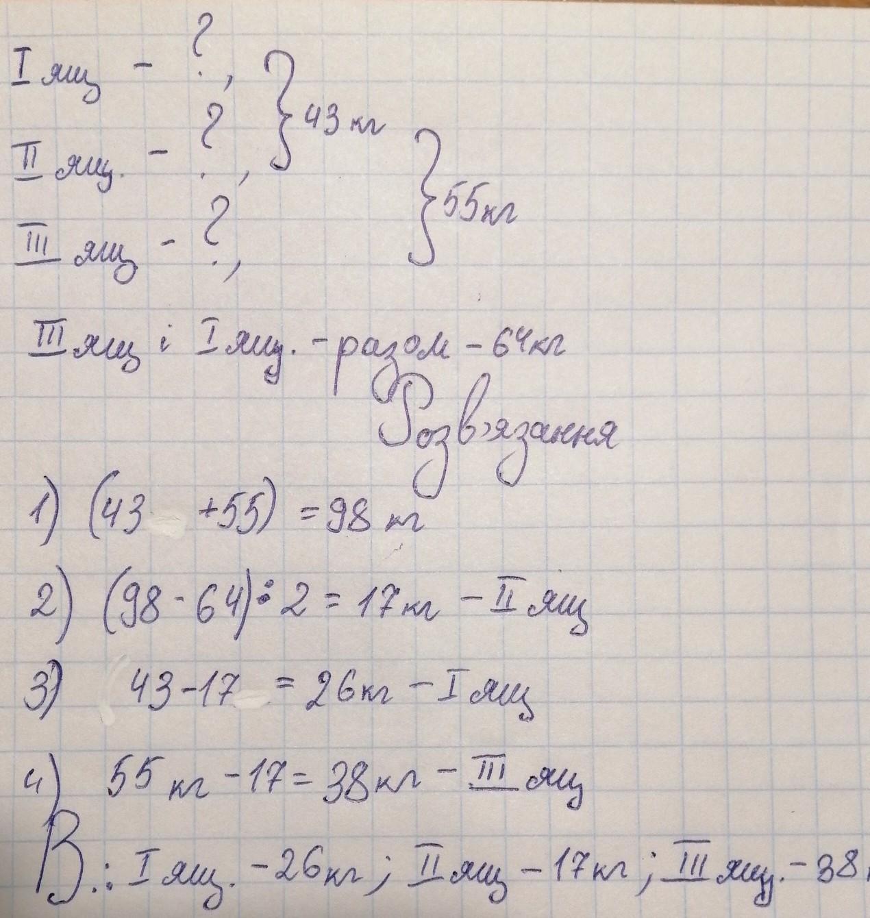 ящиках 43 кг яблук, у другому й третьому 55 кг, а в першому та