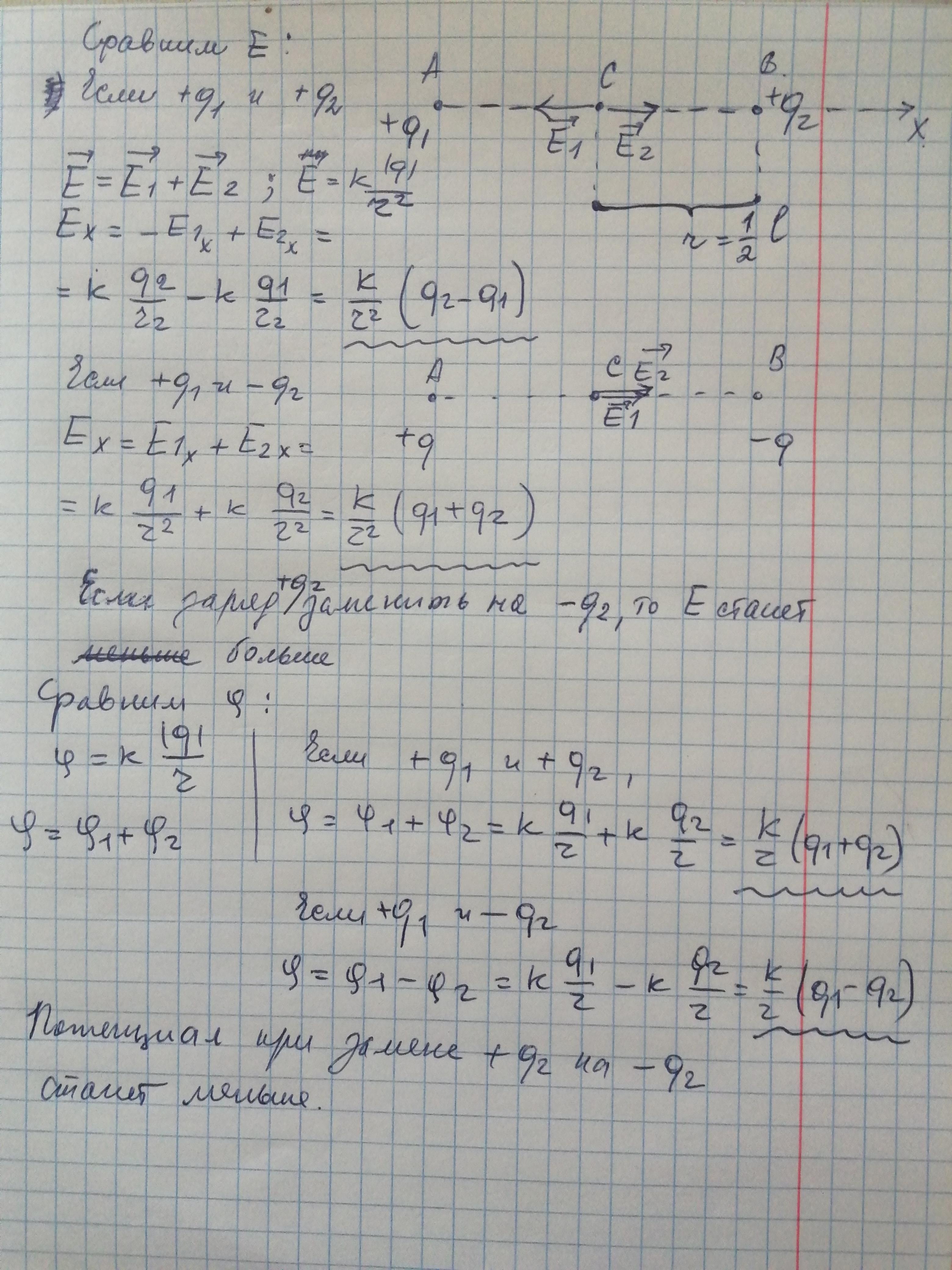 В точках А и В находятся два положительных точечных заряда q1 и q2. Точка С находится в середине отрезка АВ. Как изменятся напряженность и потенциал электрического поля в точке С, если положительный заряд q2 в точке В заменить на такой же по модулю отрицательный заряд.