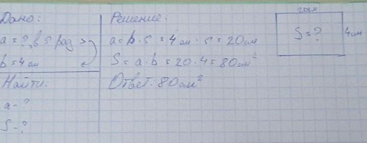 B=длинна=4*5=20(см.)=> S=4*20=80(см.^2)