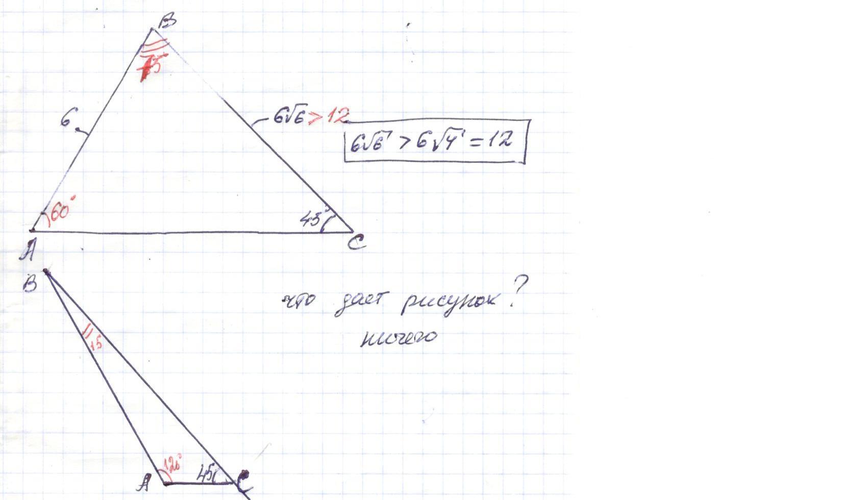 Найдите углы A и B треугольника ABC, если AB=12 см, BC=6√6 см, угол C=45° . Рассмотрите два случая, когда угол A острый и когда угол A тупой.