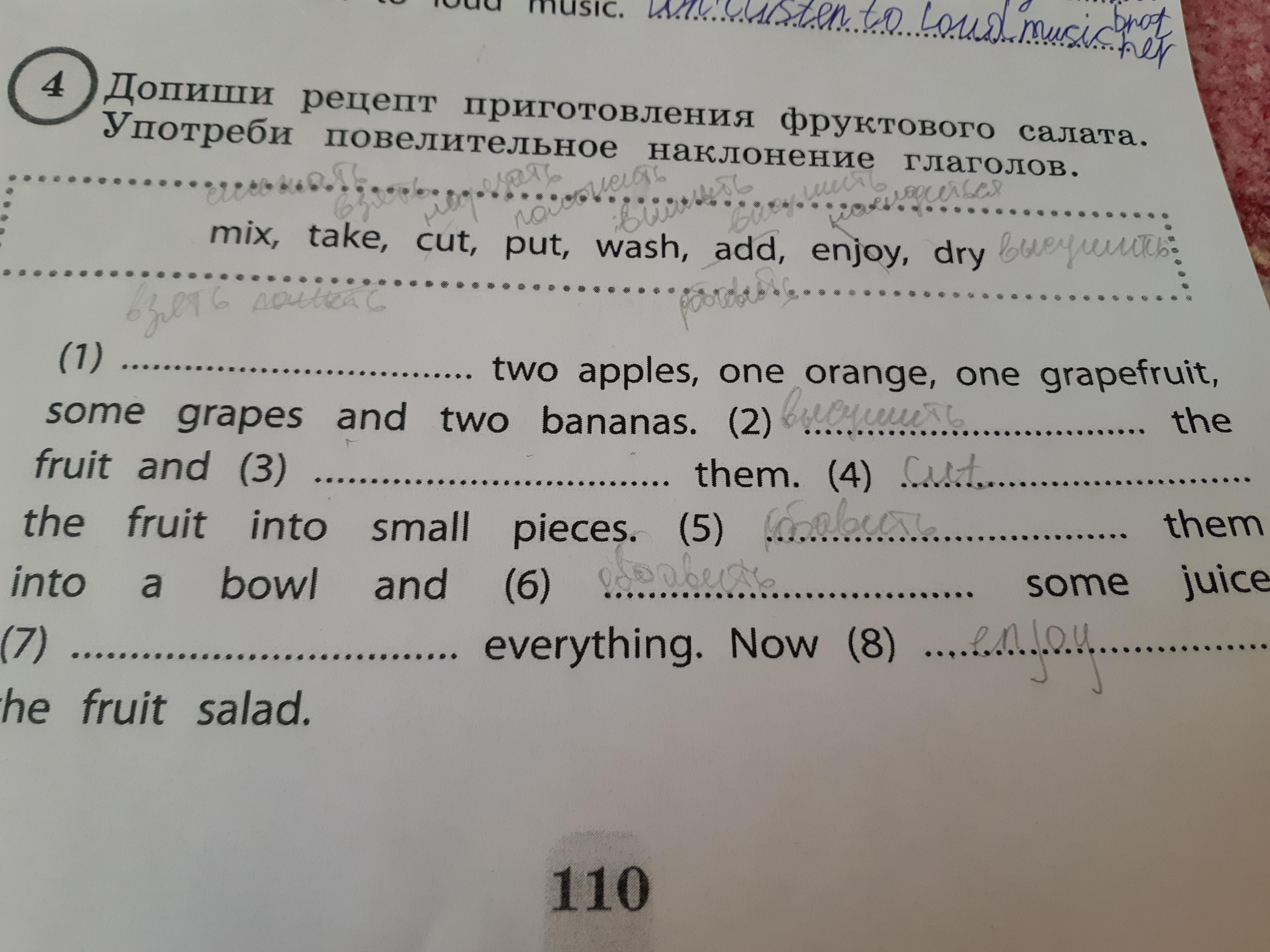 Ответ: 1) Сut 2)wash 3)take 4)put 5) dry 6)mix 7) add 8) enjoy