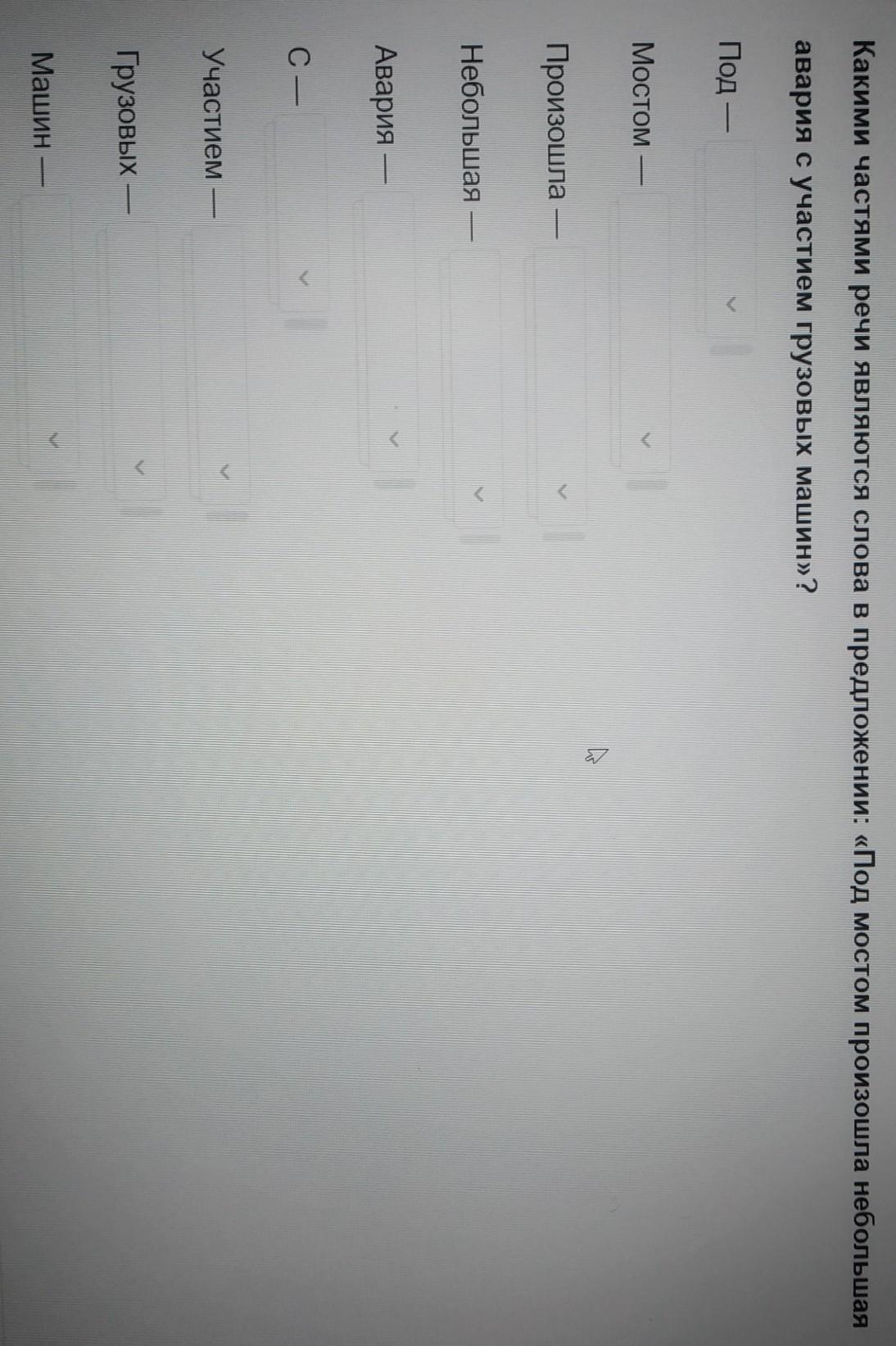 под-предлог, мостом-сущ., произошла-глагол, небольшая-прилагательное, авария-сущ., с-пердлог, участием-сущ., грузовых-прилагательное., машин-сущ;