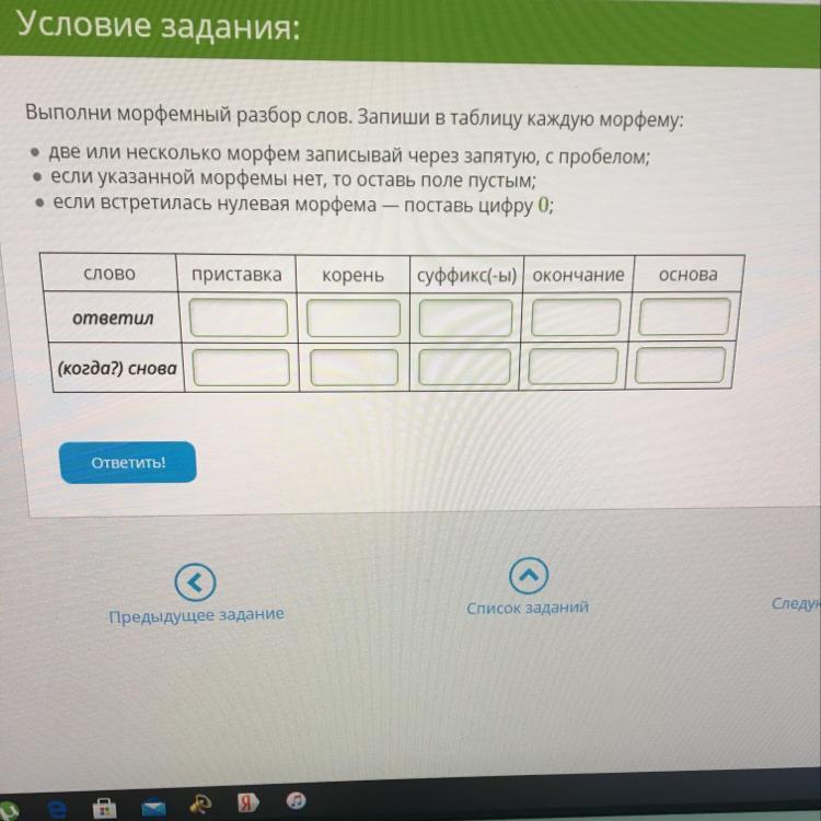 Выполни морфемный разбор слов. Запиши в таблицу каждую морфему: