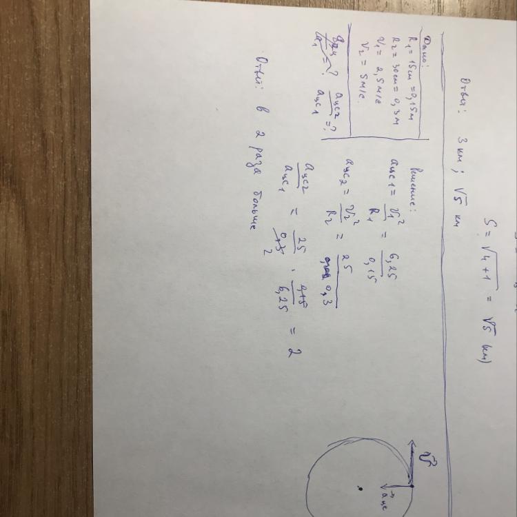 Радиус одного колеса 15 см, другого 30 см ,а линейные скорости точек на ободе колёс соответственно равны 2,5 и 5 м/с.Вр сколько раз центростремительное ускорение точек на ободе одного колеса больше чем на ободе другого?