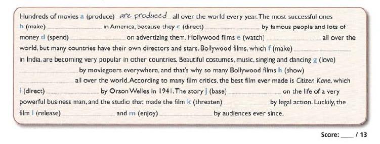 Hundreds of movies a (produce) are produced all over the world every year. The most successful ones b (make) in America, because they c (direct) by famous people and lots of money d (spend) on advertizing them. Hollywood films e (watch) all over the world, but many countries have their own directors and stars. Bollywood films, which f (make) in India, are becoming very popular in other countries. Beautiful costumes, music, singing and dancing g (love) by movicgoers everywhere, and that's why so many Bollywood films h (show) all over the world. According to many film critics, the best film ever made is Citizen Kane, which (direct) by Orson Welles in 1941.The story j (base) on the life of a very powerful business man, and the studio that made the film k (threaten) by legal action. Luckily, the film | (release) and m (enjoy) by audiences ever since. Score: 13