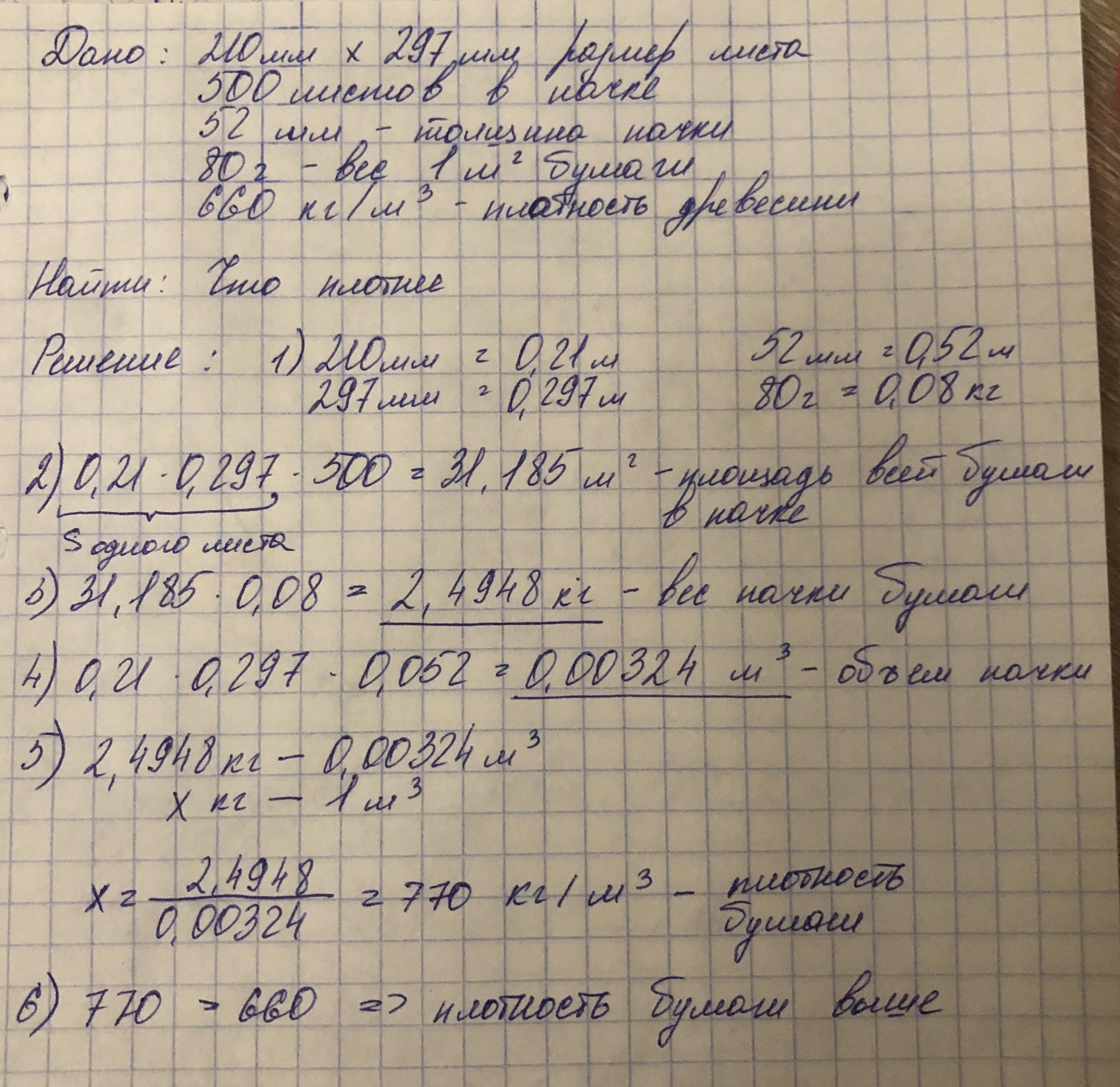 5) плотность древесины нам дана на 1 кубический метр, а объём пачки гораздо меньше, поэтому мы через пропорцию находим сколько будет весить 1 кубический метр данной нам бумаги. Заодно это число и будет плотностью нашей бумаги.