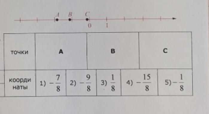 на координатной прямой отмечены точки А,В и С. установите соответствие между точками и их координатами.