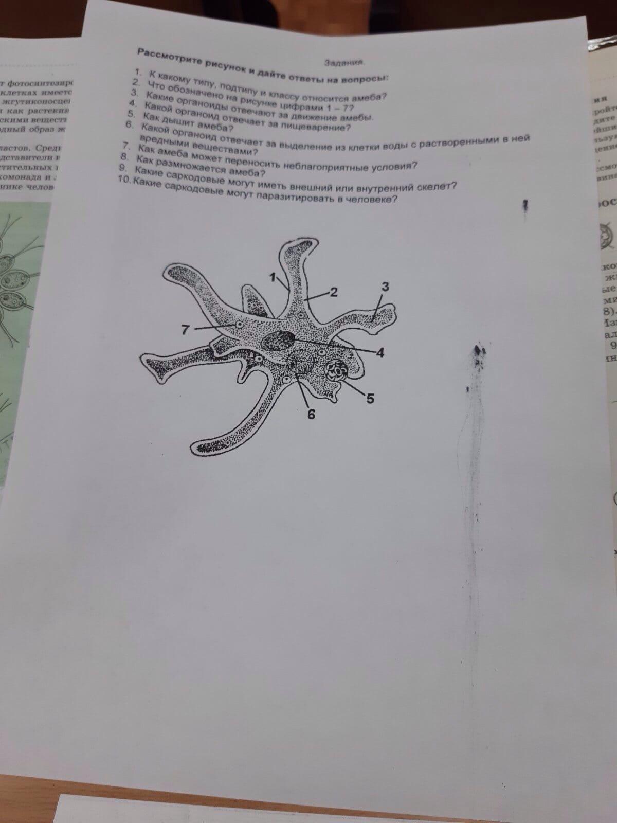 2.1-экто плазма,2-псевдоподия(плазмалеммы),3-эндоплазма,4-ядро,5-заглатываемая пища,6- вакуоль сакротительная,7-вакуоль пишеварительная.