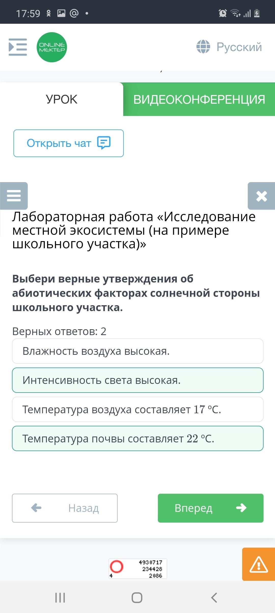 Выбери верные утверждения об абиотических факторах солнечной стороны школьного участка. Верных ответов: 2 Температура почвы составляет 22 ºС. Влажность воздуха высокая. Температура воздуха составляет 17 ºС. Интенсивность света высокая.