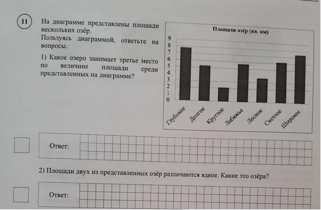 На диаграмме представлены площади нескольких озер.Пользуйтесь диаграммой,ответьте на вопрос.1)Какое озеро занимает 3 место по величине площади среди представленных на диаграмме? 2)Площади двух из представленных озер различаются в двое.Какие это озеры?Пожалуйста Срочно дам 14 баллов