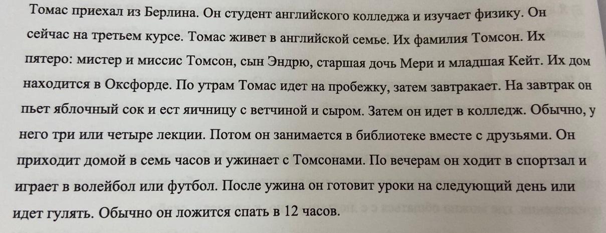 Thomas came from Berlin. he is an English College student studying physics. he's in his third year now. Thomas lives in an English family. their last name is Thomson. there are five of them: Mr and Mrs Thomson, son Andrew, eldest daughter Mary and youngest Kate. their home in Oxford. in the morning, Thomas goes for a run, then has Breakfast. for Breakfast, he drinks Apple juice and eats eggs with ham and chese. then he goes to College. usually, he has three or four lectures. then he studis in the library with hus friends. he comes home at seven oclock and has dinner with the thomsons. in the evenings, he goes to the gym and plays voleyball or soccer. after dinner, he prepares lesons for the next day or goes for a wolk. he usualy goes to bed at 12 oclock.