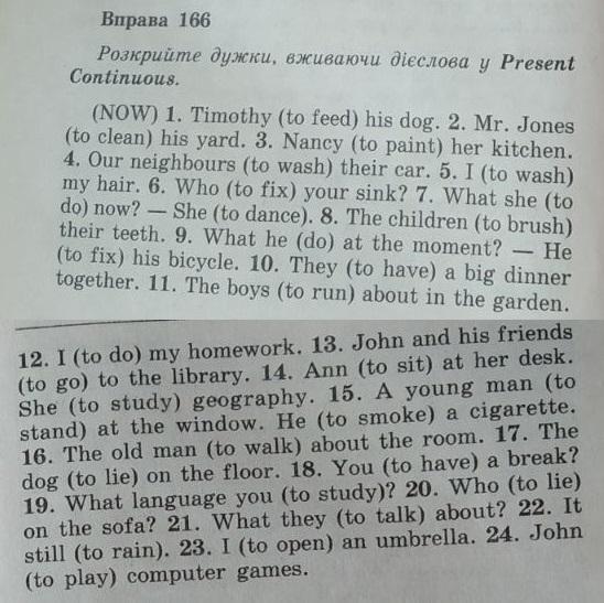 Ответ: 1) is feeding 2) is cleaning 3) is painting 4) are washing 5) is washing 6) Who is fixing your sink? 7) What is she doing now? ; is dancing 8) are brushing 9) What is he doing at he moment? : is fixing 10) are having 11) are running 12) am doing 13) are going 14) is sitting; is studying 15) is standing; is smoking 16) is walking 17) is lying 18) Are you having a break? 19) What language are you studying? 20) Who is lying on the sofa? 21) What are they talking about? 22) It is still raining 23) am opening 24) is playing