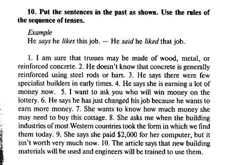 1. I was sure that trusses might be made of wood, metal, or reinforced concrete. 2. He didn’t know that concrete was generally reinforced using steel rods or bars. 3. He said there had been few specialist builders in early times. 4. He said that she was earning a lot of money then. 5. I wanted to ask you who would win money on the lottery. 6. He said he had just changed his job because he wanted to earn more money. 7. She wanted to know how much money she might need to buy that cottage. 8. She asked me when the building industries of most Western countries had taken the form in which we found them that day. 9. She said she had paid $2,000 for her computer, but it wasn’t worth very much then. 10. The article said that new building materials would be used and engineers would be trained to use them.