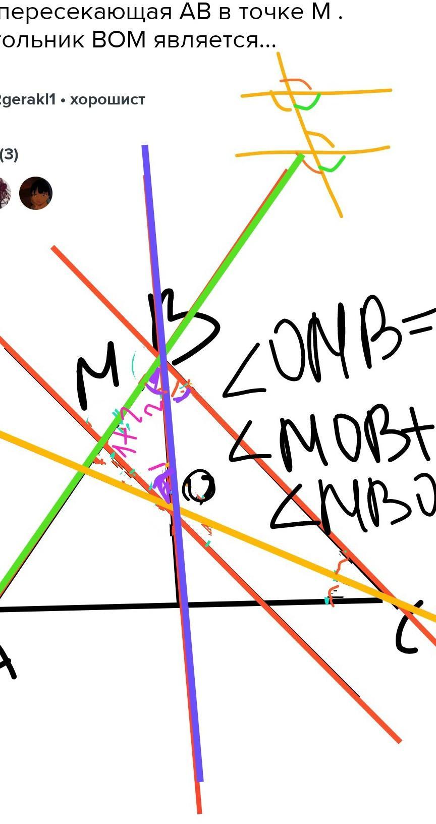 Фиолетовая прямая - секущая для двух красных параллельных и по свойству накрест лежащих углов ОBC = MOB, а так как фиолетовая прямая биссектриса ABC, то OBC = OBA => OBA = MOB => ∆BOM Равнобедреный, а OMB = MOB + MBO