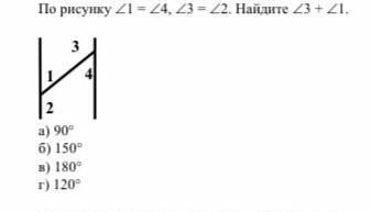 Т.к. угол1 = угол4, угол2 = угол3, получается, что две прямые, в которых они находятся - параллельные. Следовательно, угол1 + угол3 = 180 градусов