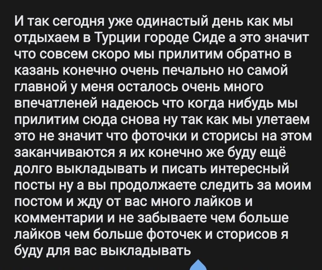 Итак, сегодня уже 11-й день как мы отдыхаем в Турции, городе Сиднее, а это значит, что совсем скоро мы прилетим обратно в Казань, конечно, очень печально ,но самое Главное у меня осталось очень много впечатлений, надеюсь, что когда-нибудь мы прилетим сюда снова, но так как мы улетаем это не значит, что фоточки и сторис на этом заканчивается, я их конечно же буду ещё долго выкладывать и писать интересные посты, но а вы продолжайте следить за моими постами и я жду от вас много лайков и комментариев, и не забывайте, чем больше лайков, тем больше фоточек и сторис я буду для вас выкладывать
