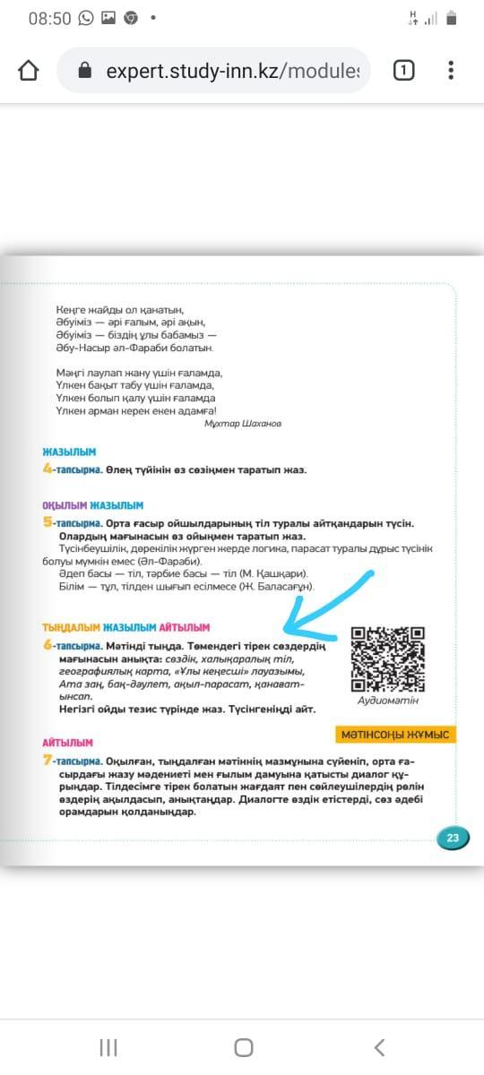 6 тапсырма мәтінді тыңда . төмендегі тірек сөздердің мағынасын анықта : сөздік , халықаралық тіл , географиялық карта , "Ұлы кеңесші" , лауазымы , Ата заң , бақ-даулет , ақыл-парасат , қанағатынсап . Негізгі ойды тезис түрінде жаз . ТүсінгенІнді айт .