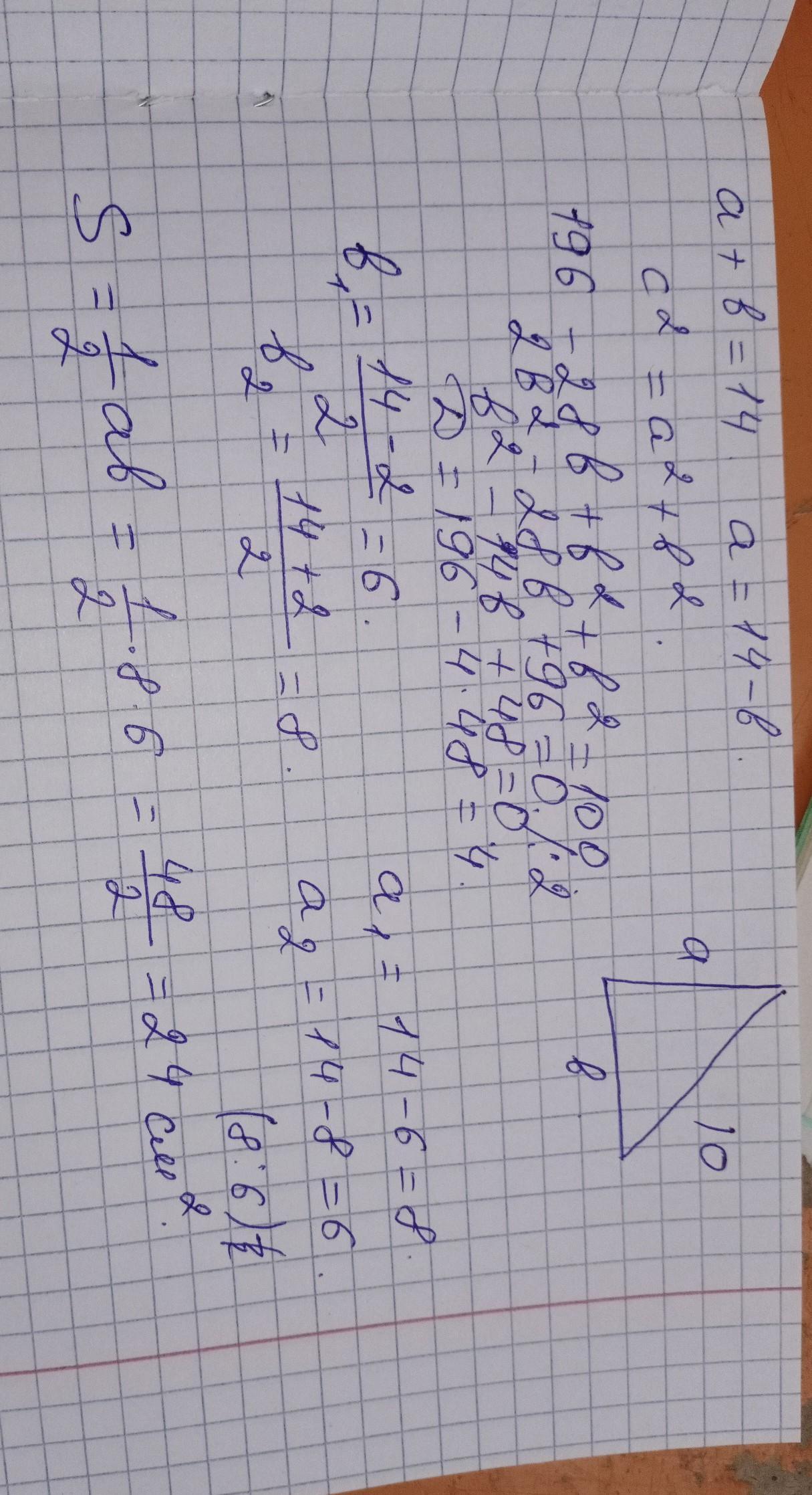 а сумма катетов – 14 см. Найдите площадь треугольника.