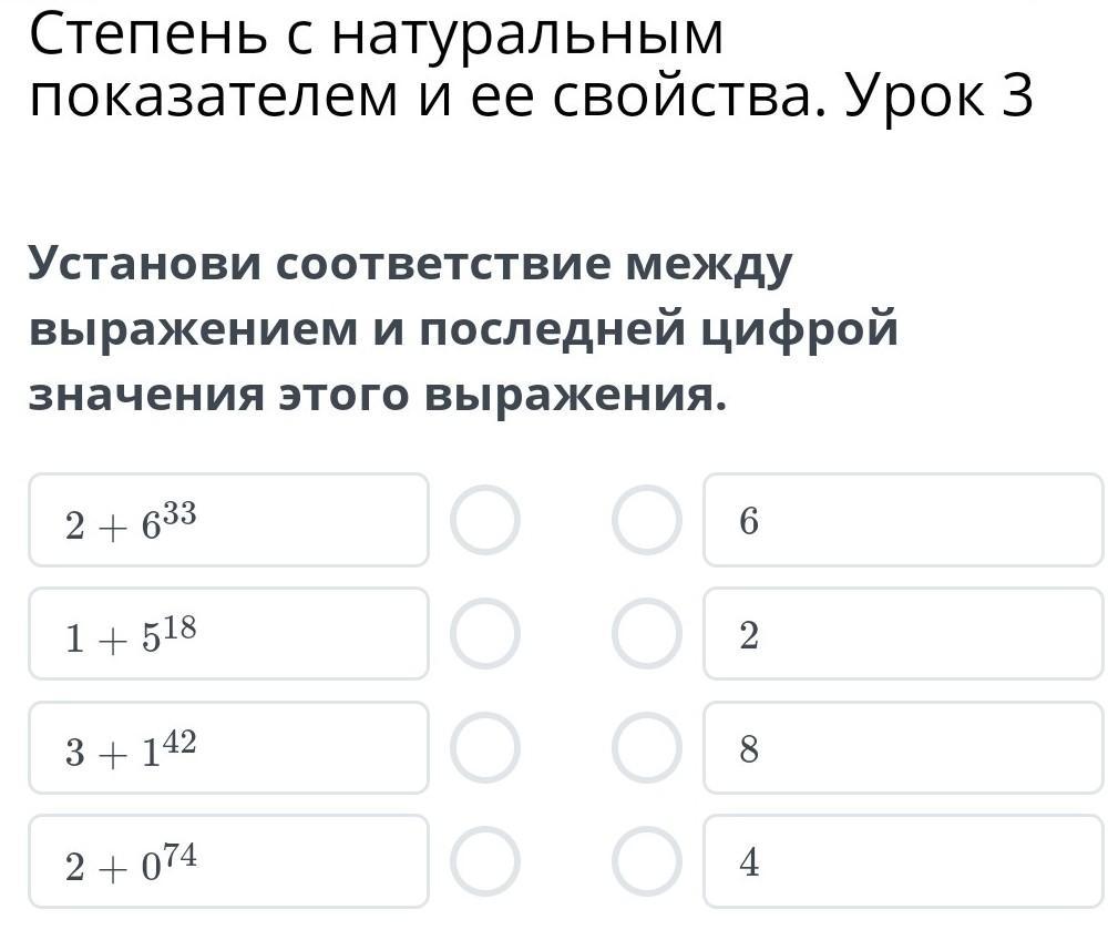 Установи соответствие между выражением и последней цифрой значения этого выражения.
