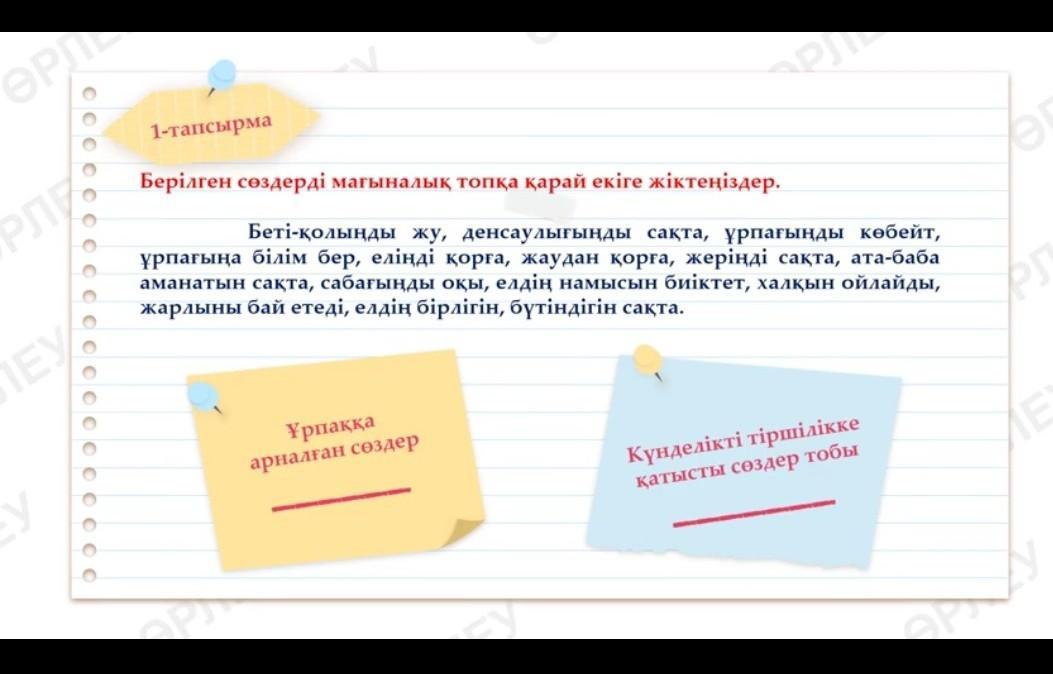 Күнделікті тіршілікке қатысты сөздер тобы:Беті қолыңды жу,денсаулығыңды сақта,сабағыңды оқы Остальное,Ұрпаққа арналған сөздер