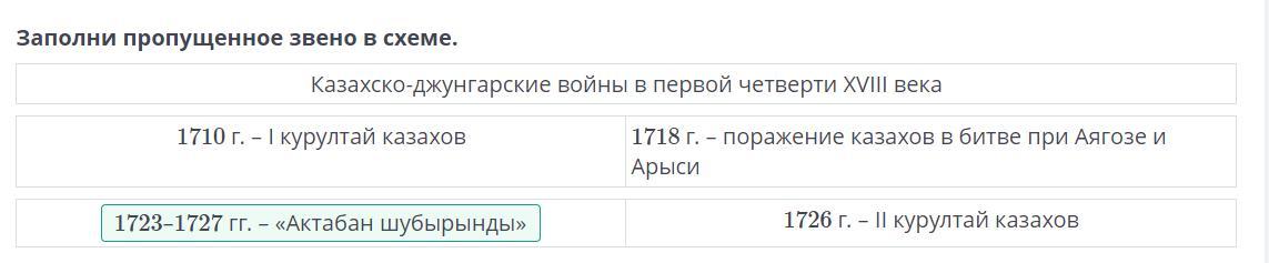 Заполни пропущенное звено в схеме. Казахско-джунгарские войны в первой четверти XVIII века 1710 г. – I курултай казахов 1718 г. – поражение казахов в битве при Аягозе и Арыси 1726 г. – II курултай казахов