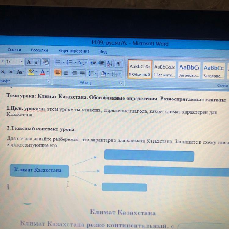 Для начала давайте разберемся, что характерно для климата Казахстана. Запишите в схему слова,