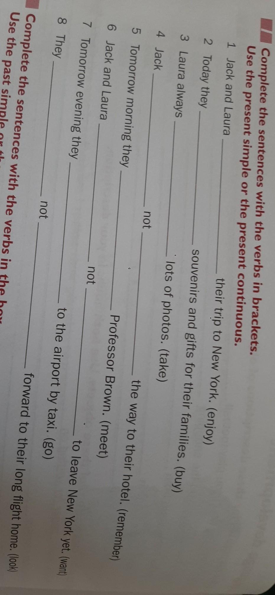 1. Enjoyed 2. Bought 3. Took 4. Did not remember 5. Will meet 6. Do not want 7. Will go 8. Did not look
