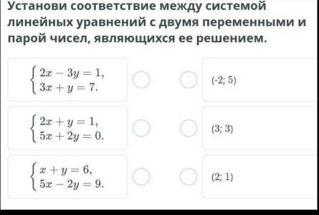Установи соответствие между системой линейных уравнений с двумя переменныи и парой чисел, являющихся ее решением.