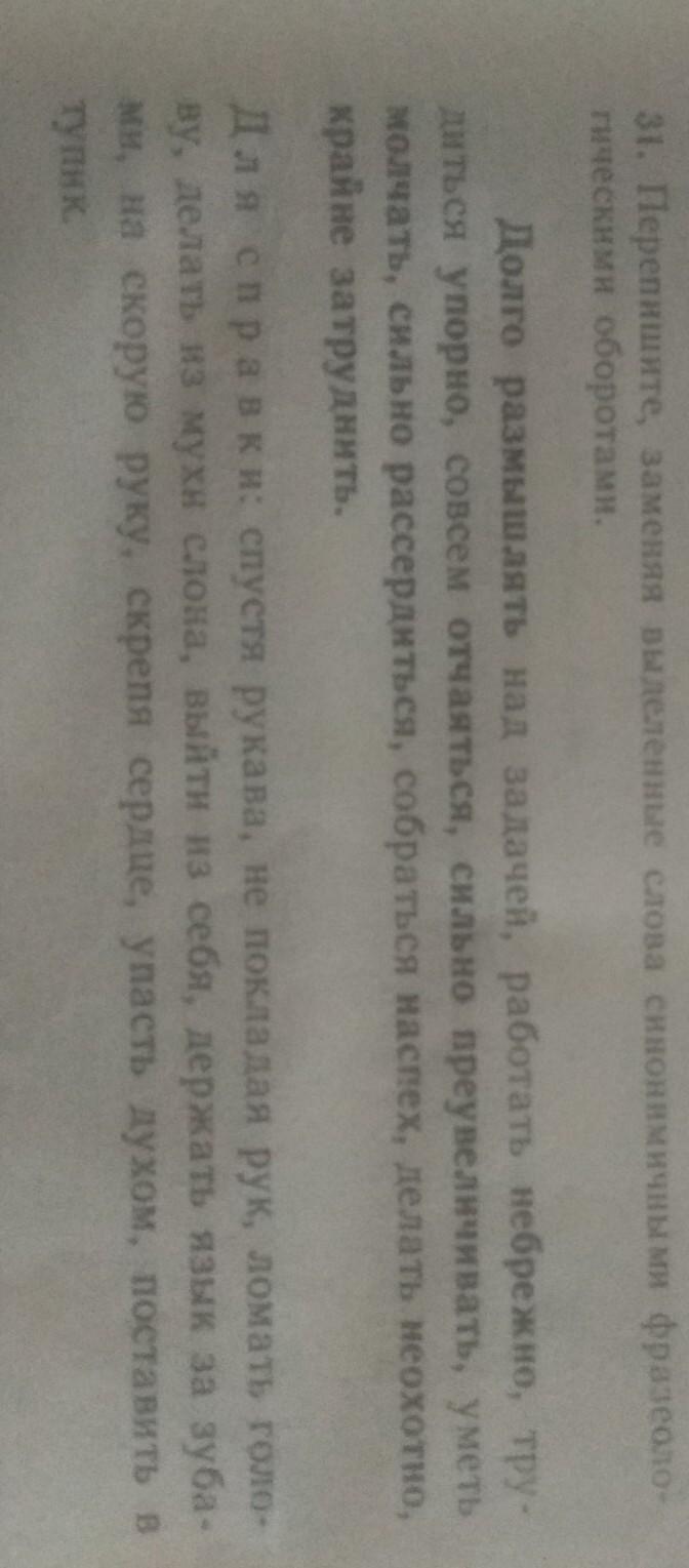 Ломать голову над задачей, работать спустя рукава,трудиться не покладая рук, совсем упасть духом,делать из мухи слона,уметь держать язык за зубами,выйти из себя,собраться на скорую руку,делать скрепя сердце,поставить в тупик