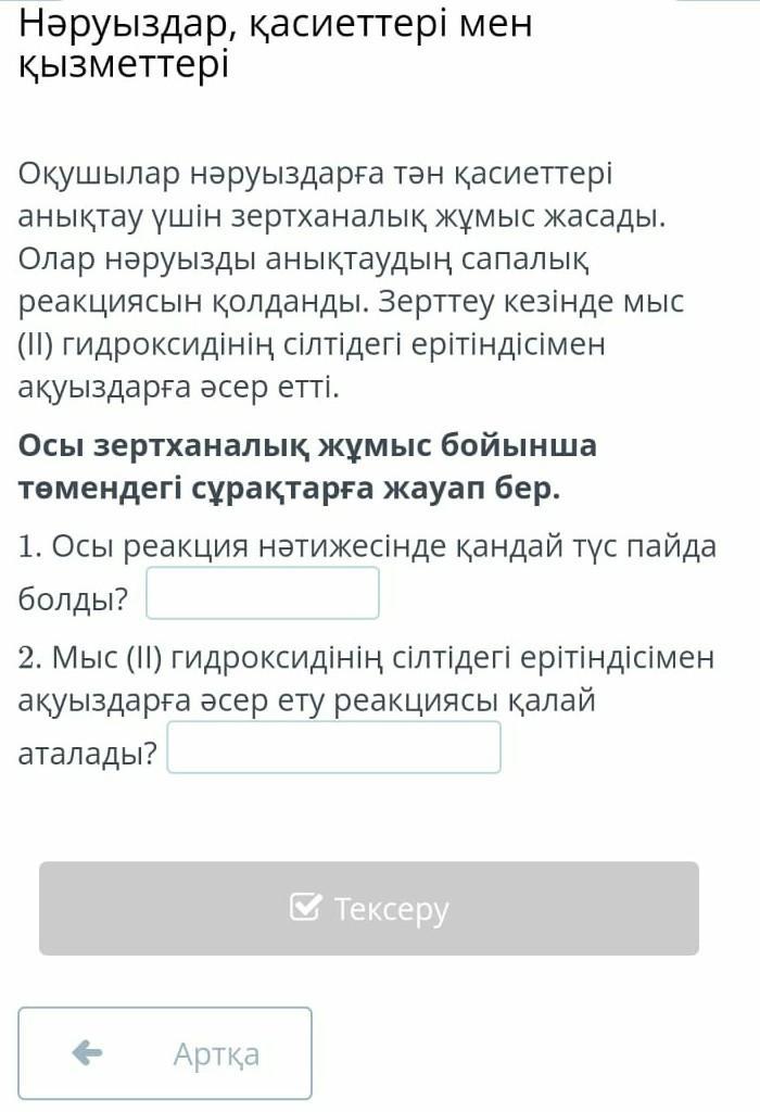 Оқушылар нәруыздарға тән қасиеттері анықтау үшін зертханалық жұмыс жасады. Олар нәруызды анықтаудың сапалық реакциясын қолданды. Зерттеу кезінде мыс (ІІ) гидроксидінің сілтідегі ерітіндісімен ақуыздарға әсер етті.