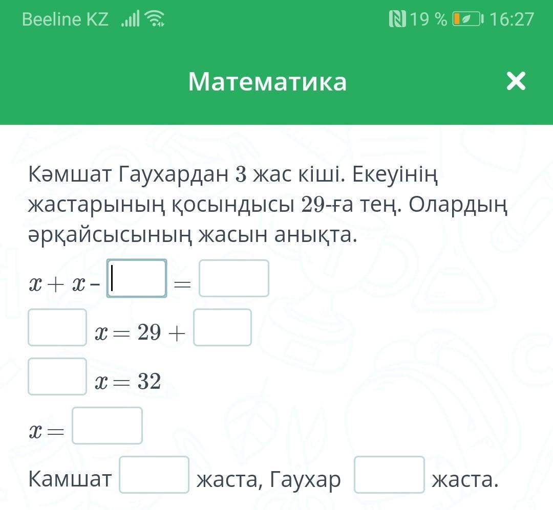 кәмшәт гаухардан 3 жас кіші екеуінің жастарының қосындысы 29 ға тең олардың әрқайсысының жастарын тап