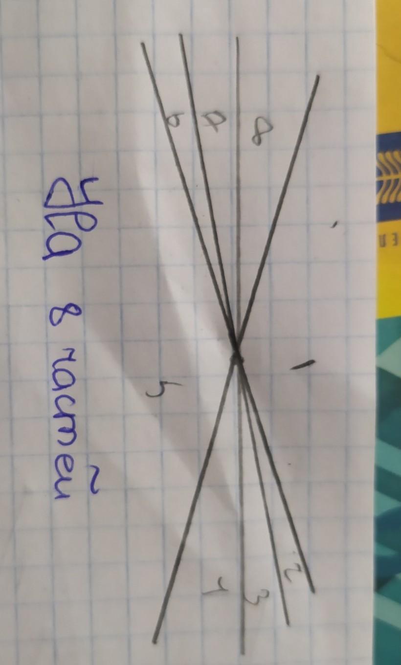изобразите четыре прямые ,пересекающиеся в одной точке.на сколько частей они разбивают плоскость