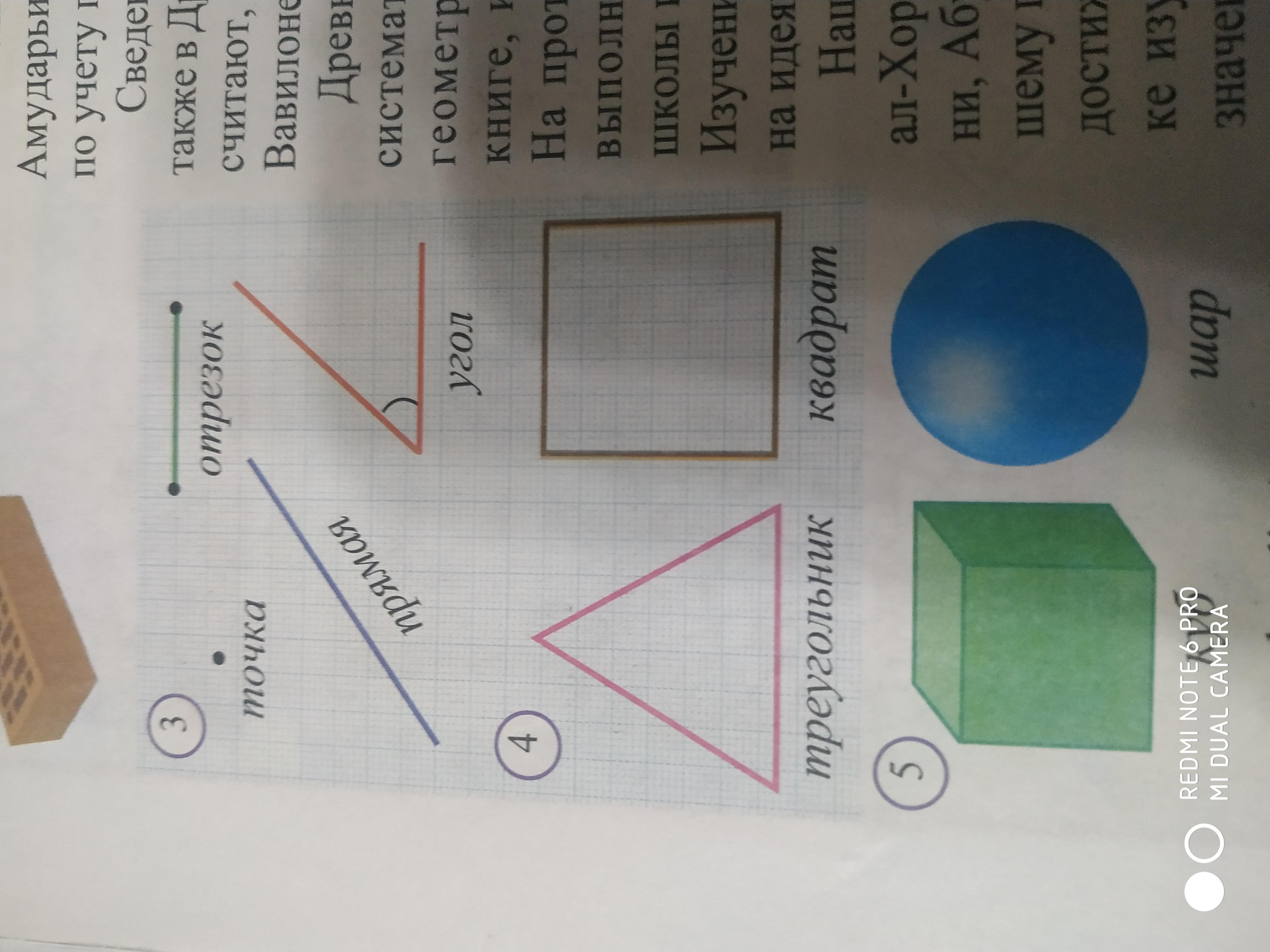 Точка, отрезок, прямая, угол, треугольник и квадрат.