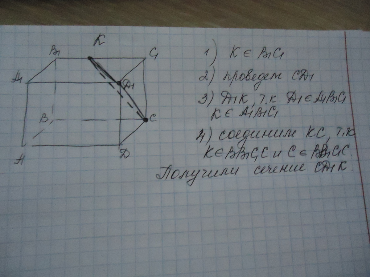 В параллелепипеде АВСДА1В1С1Д1 постройте сечение плоскостью, проходящей через вершины С и Д1 и точку К принадлежащая В1С1
