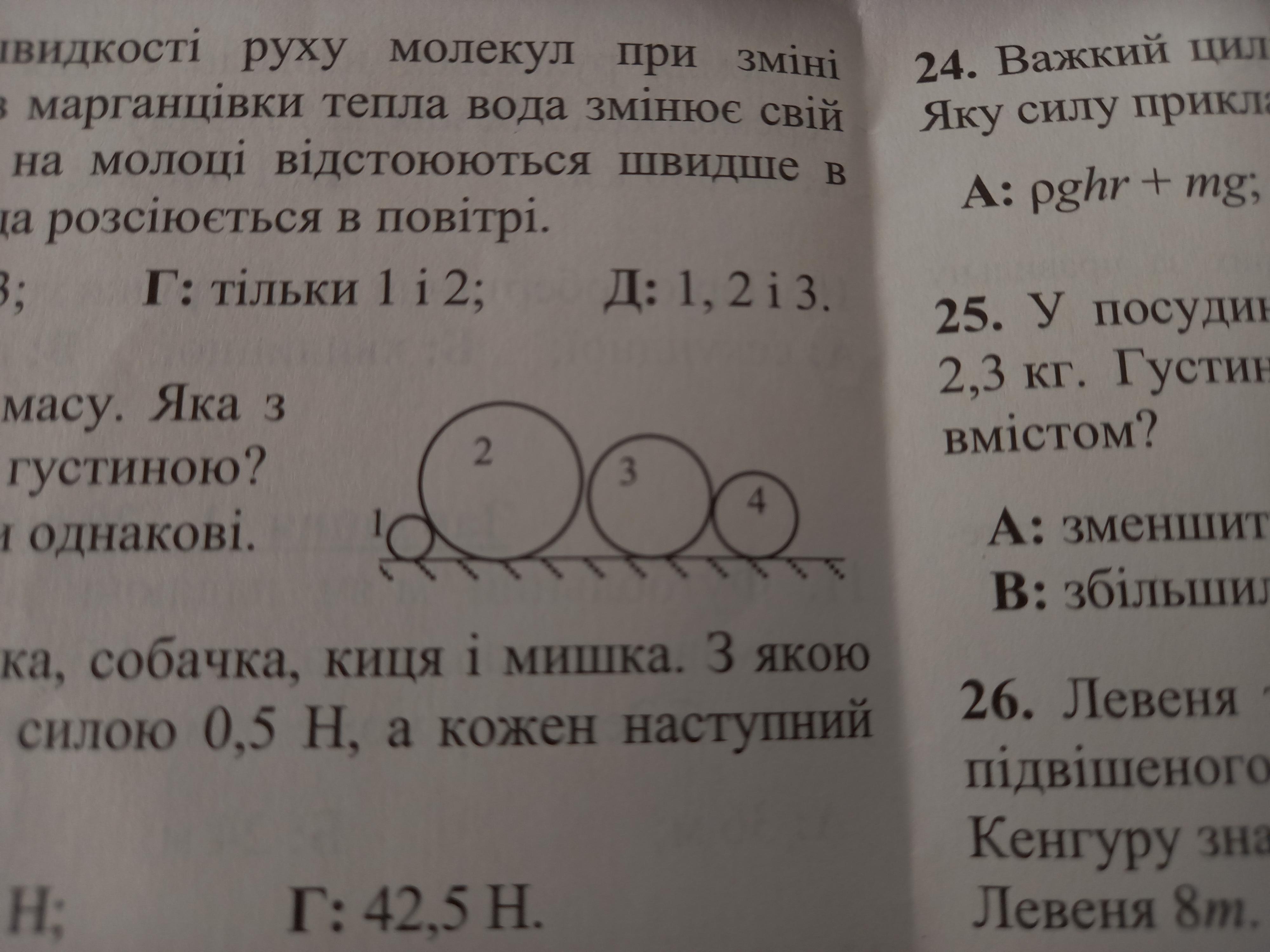 ТЕРМІНОВО!!! Усі кульки суцільні і мають однакову масу. Яка з цих куль зроблена з речовини з найбільшою густиною?