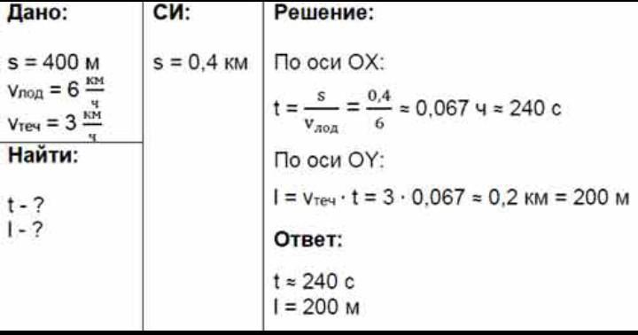 Гребец переправляется через реку шириной 400 м, удерживая все время лодку перпендикулярно берегам. Скорость лодки относительно воды 6 км/ч, скорость течения реки 3 км/ч. Сколько времени займет переправа? На какое расстояние вдоль берега снесет лодку за время переправы?