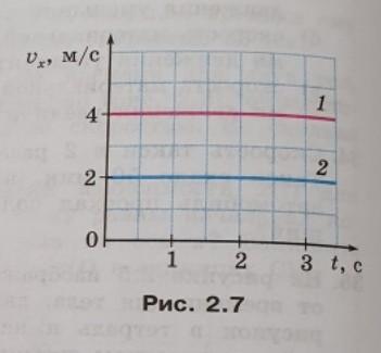 На рисунке 2.7 изображены графики зависимости проекции скорости на ось x от времени для двух велосипедистов, движущихся вдоль оси x. Постройте графики зависимости пути от времени для этих велосипедистов