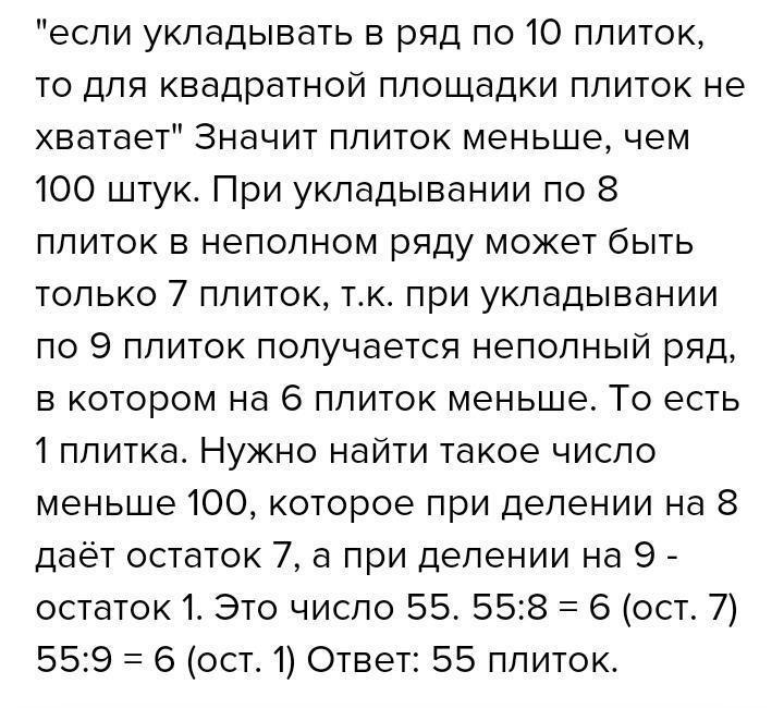 После строительства ангара осталось некоторое количество плиток. Их можно использовать для выкладывания прямоугольной площадки на участке рядом с ангаром. Если укладывать в ряд по 8 плиток, то для квадратной площадки плиток не хватит. При укладывании по 6 плиток в ряд остаётся один неполный ряд, а при укладывании по 7 плиток тоже остаётся неполный ряд, в котором на 4 плит(-ок, -и) меньше, чем в неполном ряду при укладывании по 6. Сколько всего плиток осталось после строительства?