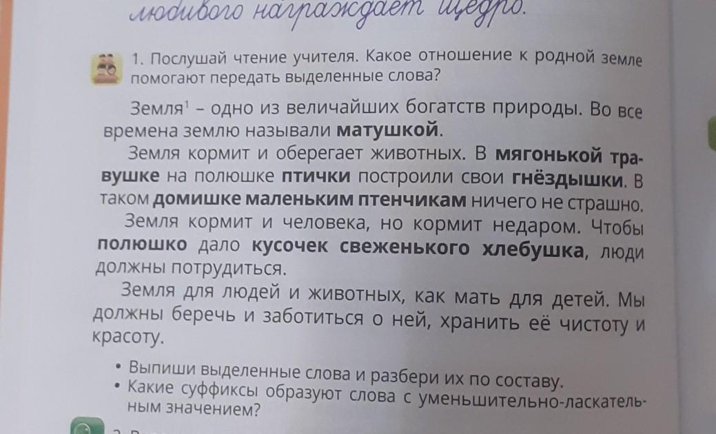 мат - ушк - ой, мяг- оньк - ой, трав-ушк-е, птич-к-и, гнезд-ышк-и, дом-ишк-е, мал-еньк-им, птен-чик-ам, пол-юшк-о, кус-очек, свеж-еньк-ого, хлеб-ушк-а.