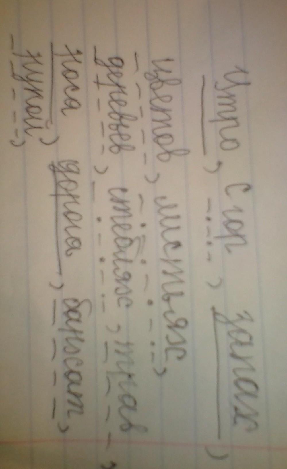 Ответ: Утро, гор, запах, цветов, листьях, деревьев, стеблях, трав, роса, дорога, бархат, рукой.