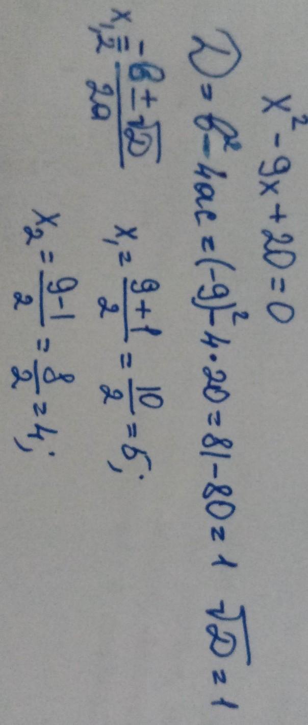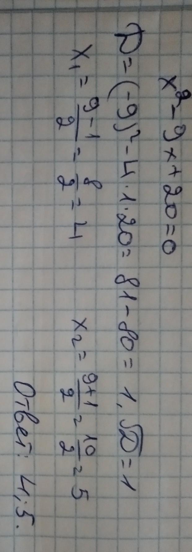D=b^2-4ac=(-9)^2-4*20=81-80=1 корень из D=1