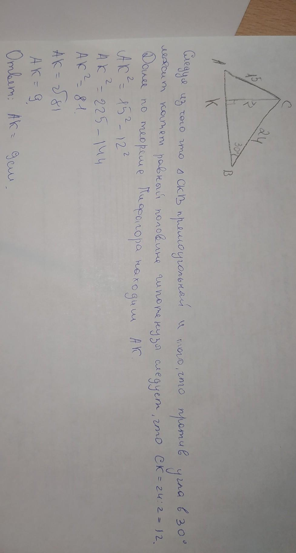 В треугольнике ACB, CK-высота, CB=24 см, CA= 15 см, угол B =30 градусов, CKB= 90 градусов. Найти AK.