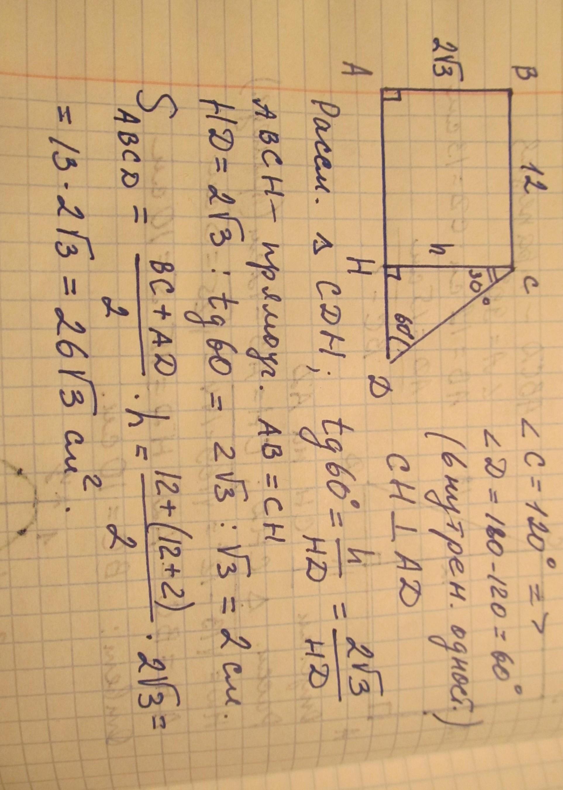 Меньшее основание прямоугольной трапеции равно 12 см, а меньшая боковая сторона - 2 корня из 3 см. Найдите площадь трапеции, если один из ее углов равен 120 градусов.
