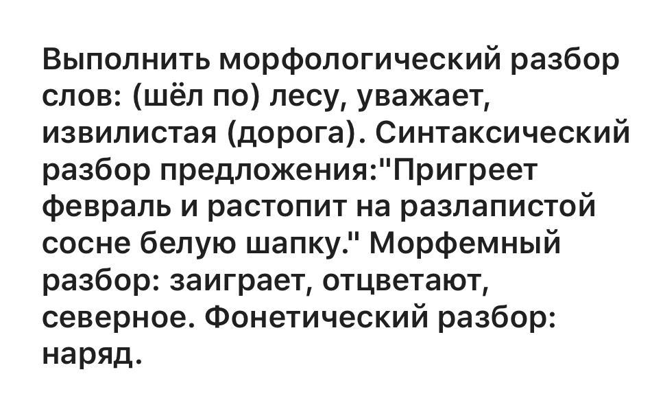 Выполнить морфологический разбор слов: (шёл по) лесу, уважает, извилистая (дорога). Синтаксический разбор предложения:"Пригреет февраль и растопит на разлапистой сосне белую шапку." Морфемный разбор: заиграет, отцветают, северное. Фонетический разбор: наряд.